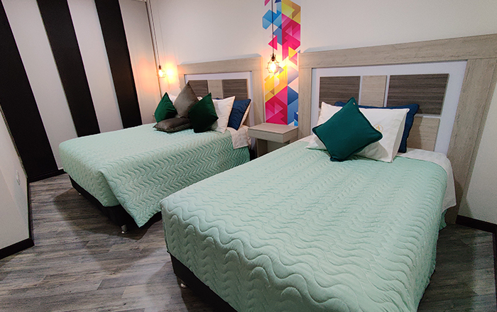 - Habitación con dos camas de capacidad para 3 o 4 personas con camas de 1.4m x 1.9m y 1.2m x 1.9m, lencería de alta calidad, baño moderno con agua caliente, mesas de noche con lámparas individuales, perchero y persiana con blackout.